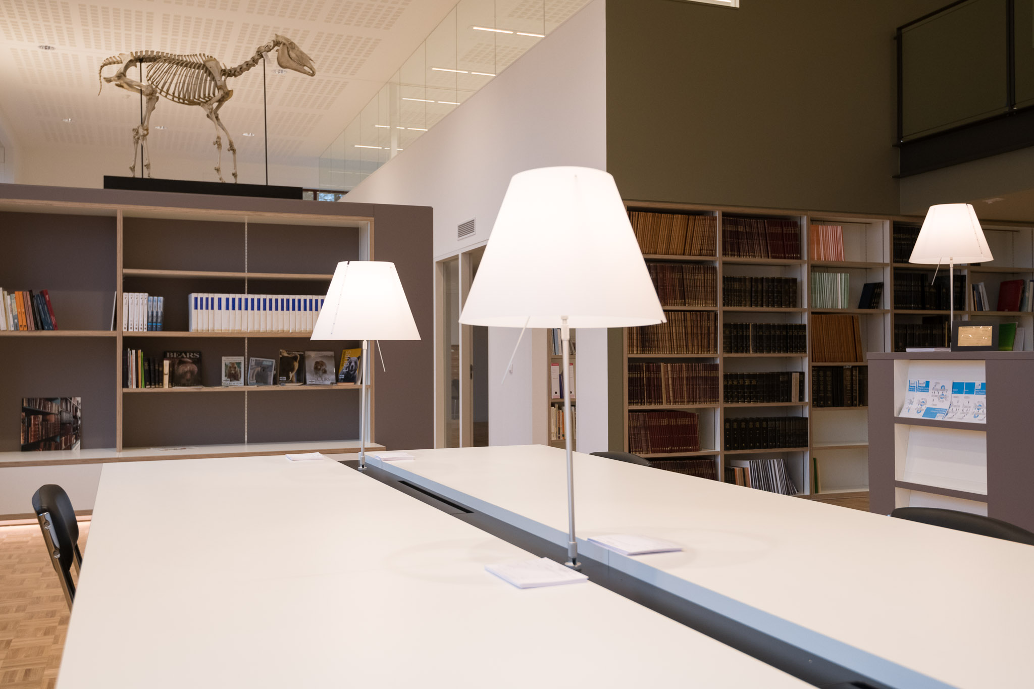 Die Bibliothek befindet sich auf Ebene -1 des Museums, zwischen " Dinosaurier" und "Entdeckung der Iguanodons".