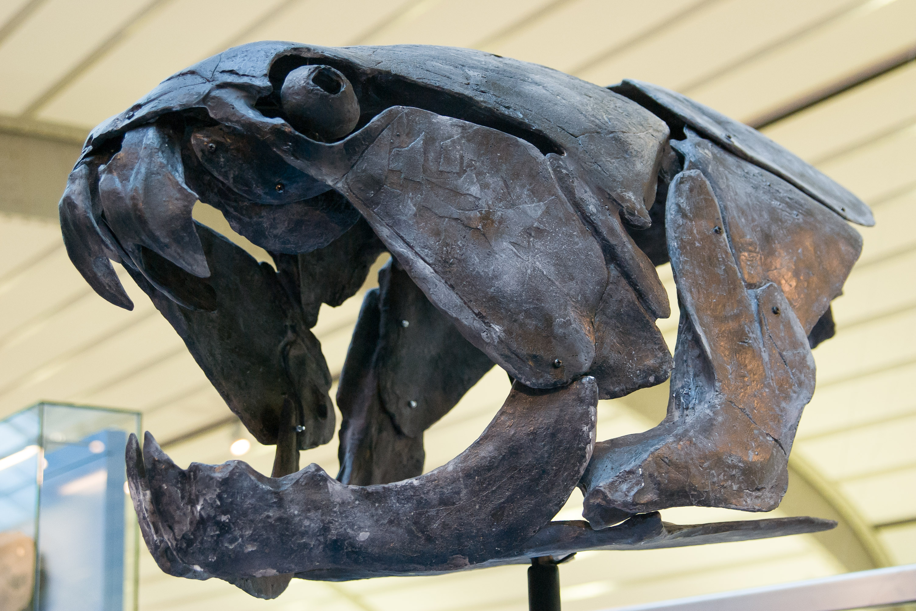Placoderms such as Dunkleosteus marsaisi were the first jawed fish. Their powerful jaws didn’t have teeth, but sharp, bony plates. The front of their body was covered with an armour of bony plates. Placoderms died out at the end of the Devonian period, leaving no descendents. Actual size of the skull: about 110 cm long, 60 cm high, and 60 cm wide.