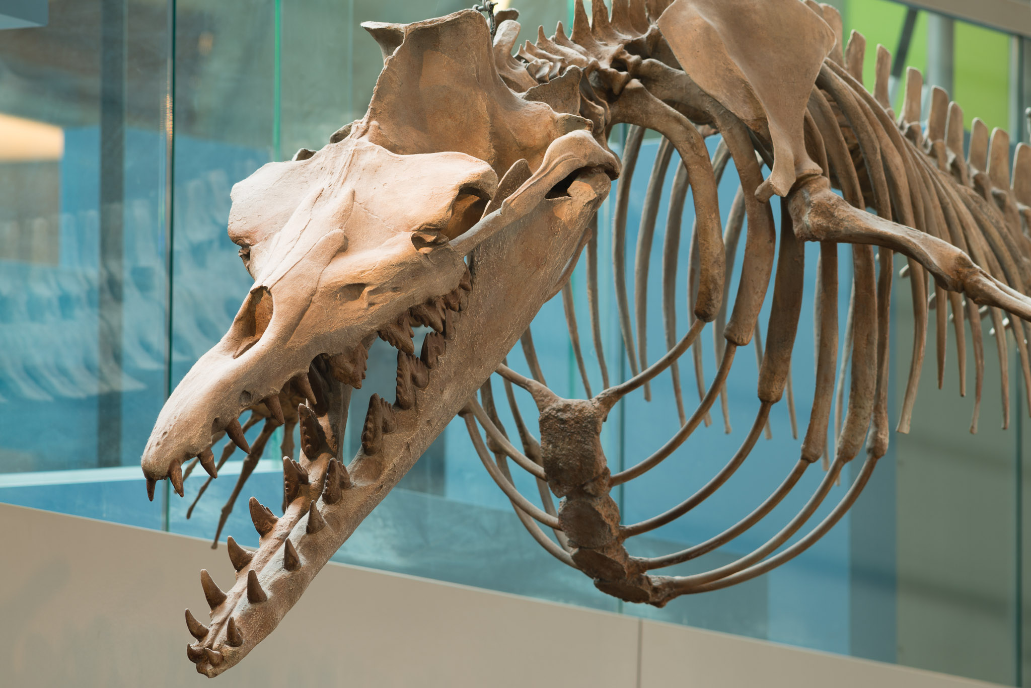 In Dorudon atrox, one of the intermediary species between modern whales and their terrestrial ancestors, the hind legs have already shrunk considerably (while they are still very visible on Rhodocetus, another species on display in the Gallery of Evolution). Size: about 5 m long.