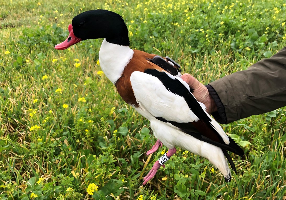 Ce Tadorne de Belon a été équipé d’un émetteur qui transmet ses données par GSM dans le cadre d’un programme qui étudie la circulation des virus de la grippe aviaire par les oiseaux sauvages.