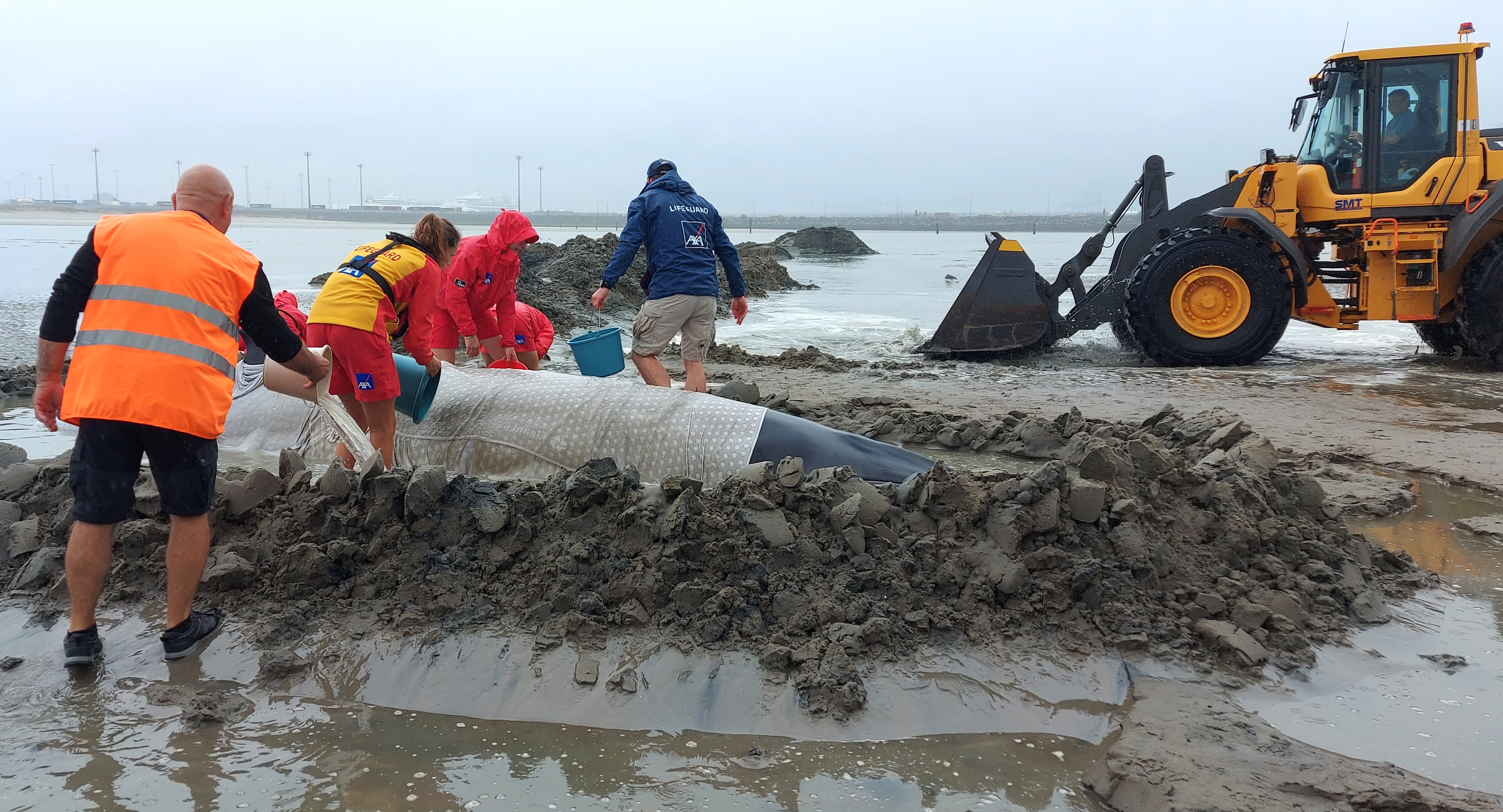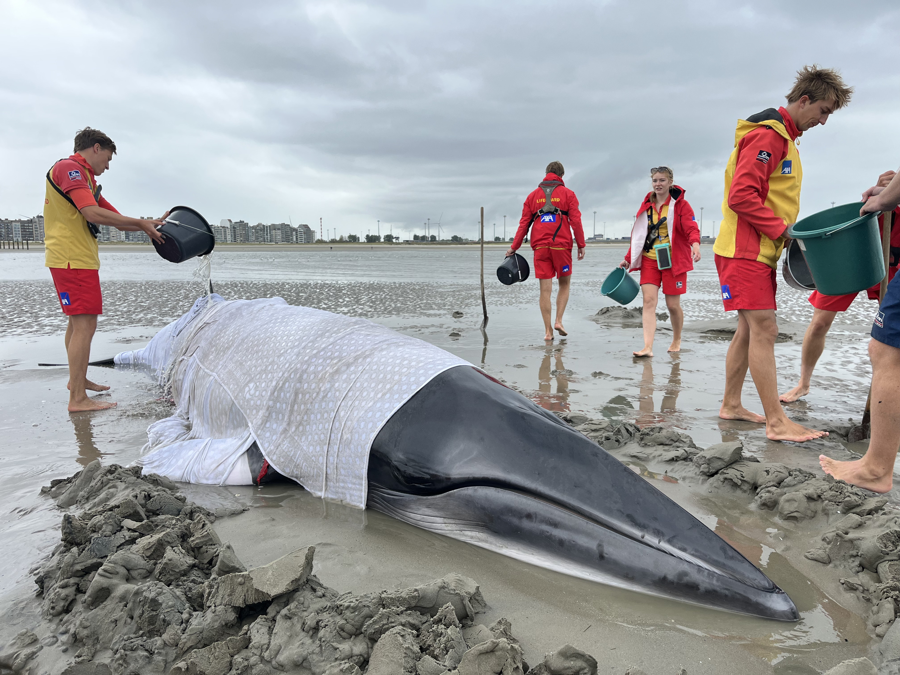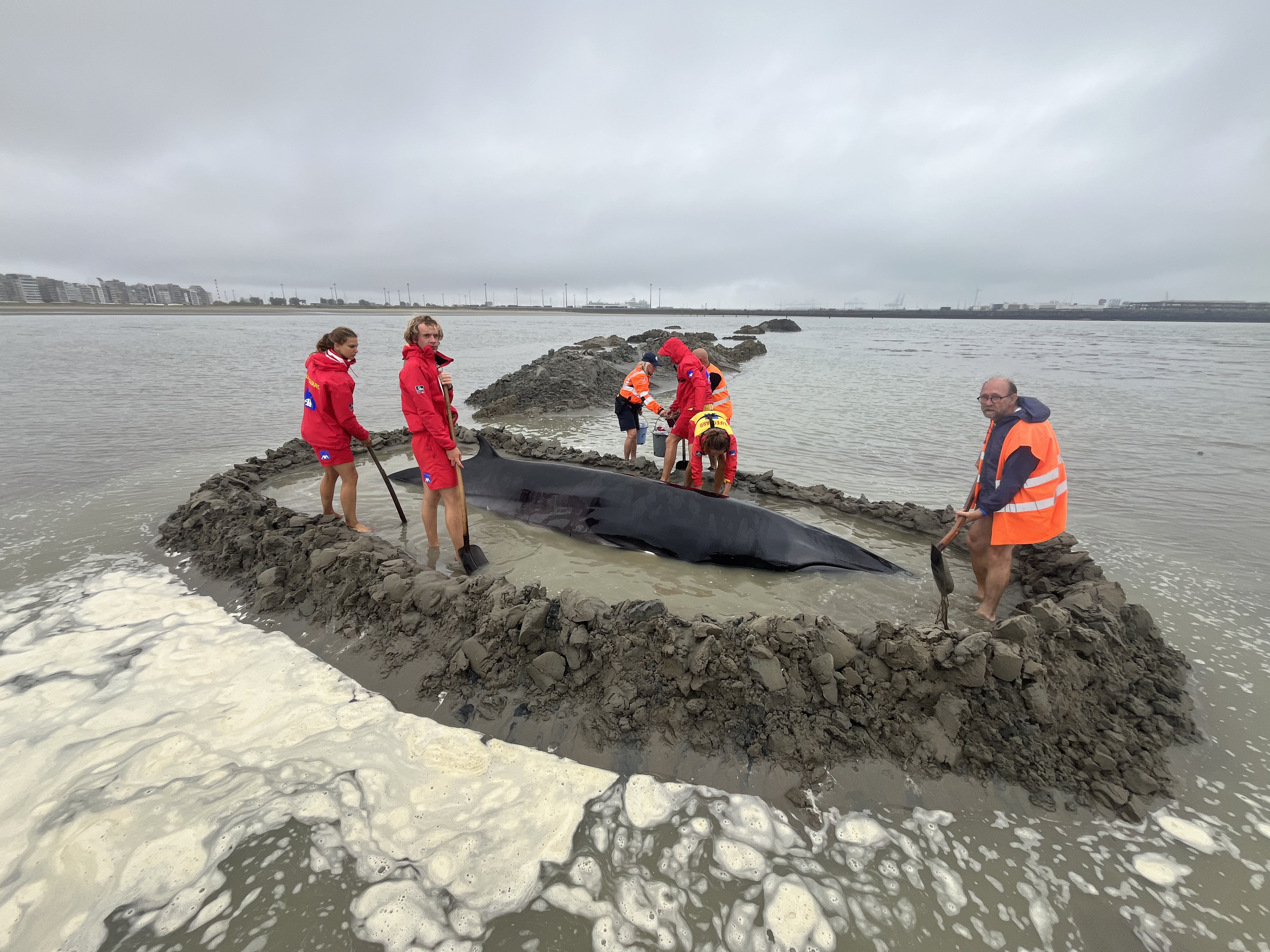 Lifeguards worked all afternoon to rescue the unfortunate minke whale. They built a wall of sand around the animal and kept it wet in a shallow pool. It's important that a cetacean on dry land is supported as much as possible to reduce the pressure of its own weight on its organs. Even a water depth of just 25 cm is better than simply lying dry.