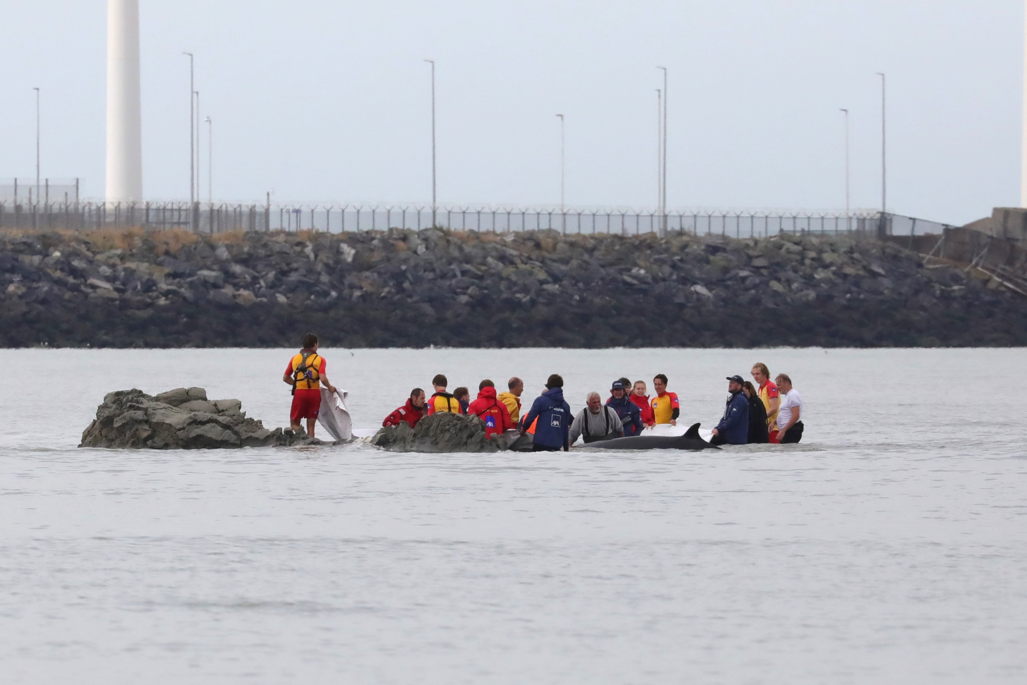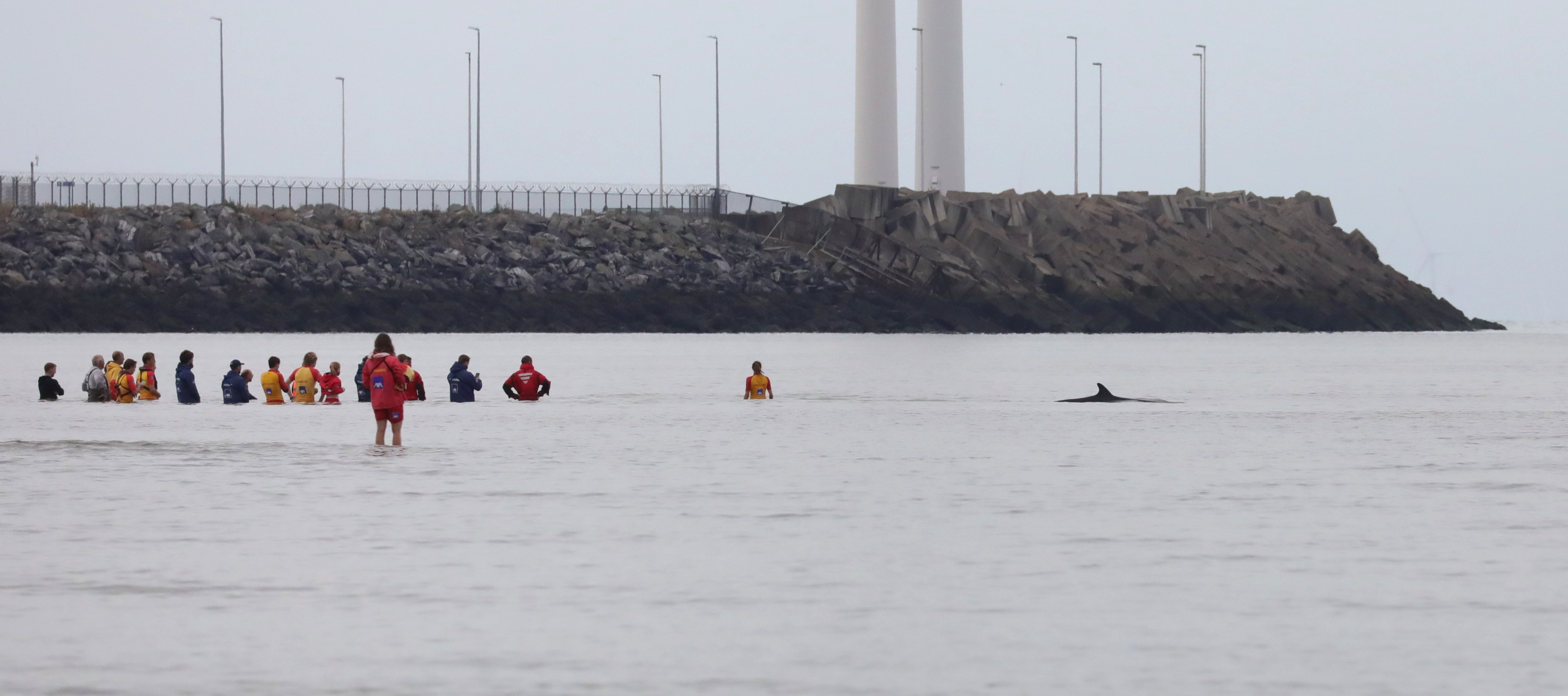 The lifeguards, along with several firefighters, a veterinarian, and a few volunteers, remained in the water for hours, initially knee-deep, but later waist-deep as the tide rose. Finally, around 4 p.m., they were able to guide the animal through the deepened channel to deeper water. After swimming back and forth for about an hour and a half further out to sea, the animal returned to shore twice. Each time, the minke whale became stuck in shallow water, but was quickly pushed back. The animal was last seen in the evening.