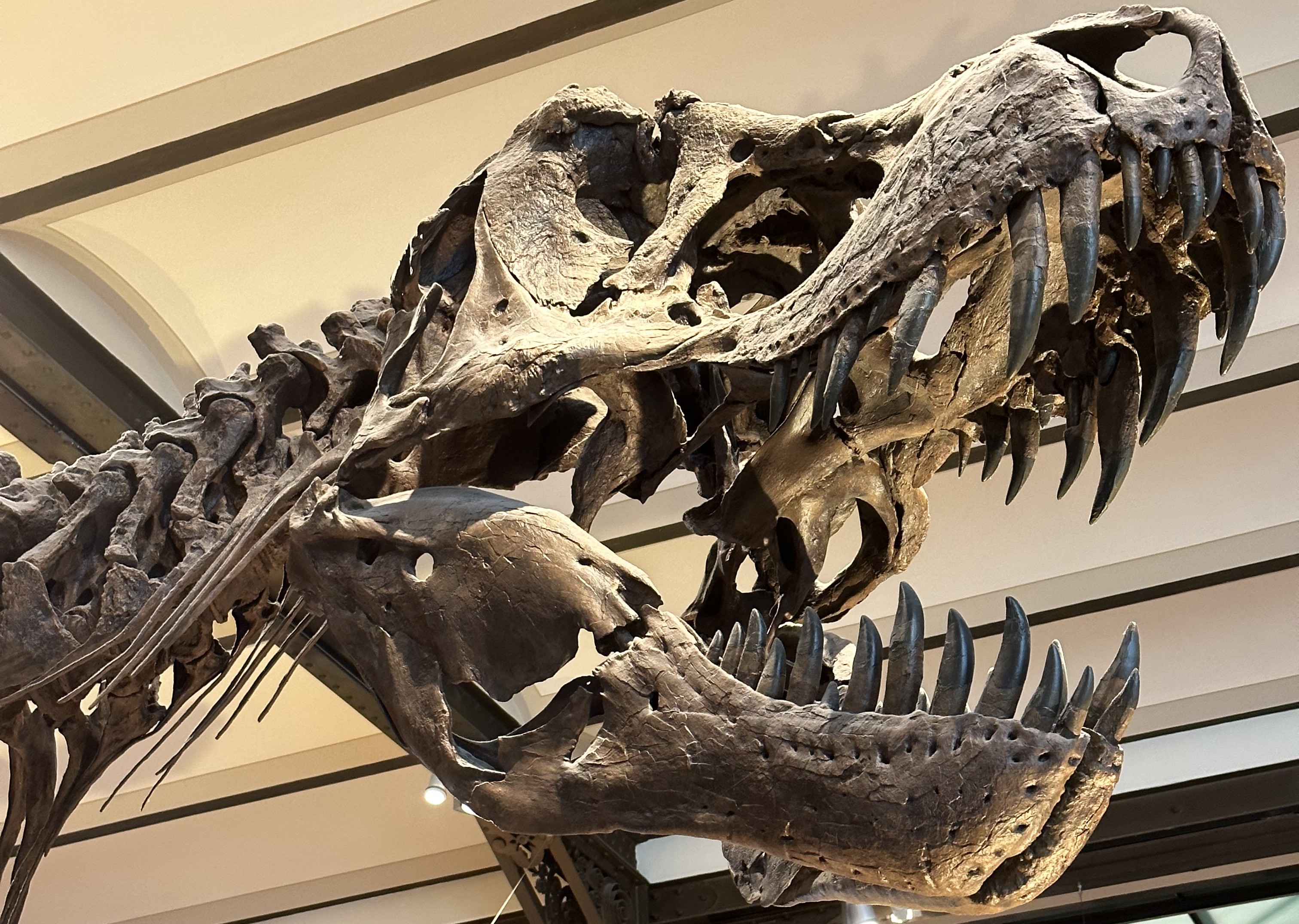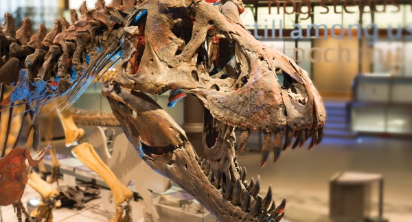 His skeleton bears the marks of many an injury: broken and healed ribs; cervical vertebrae that are fused or have become rigid owing to excess bone growth; and a hole in the back of his skull is a perfect match for… the tooth of a T. rex! Most of these injuries could have been inflicted by other tyrannosaurs, but Stan survived all of it. When he died, all of his wounds had healed already or were on the mend.