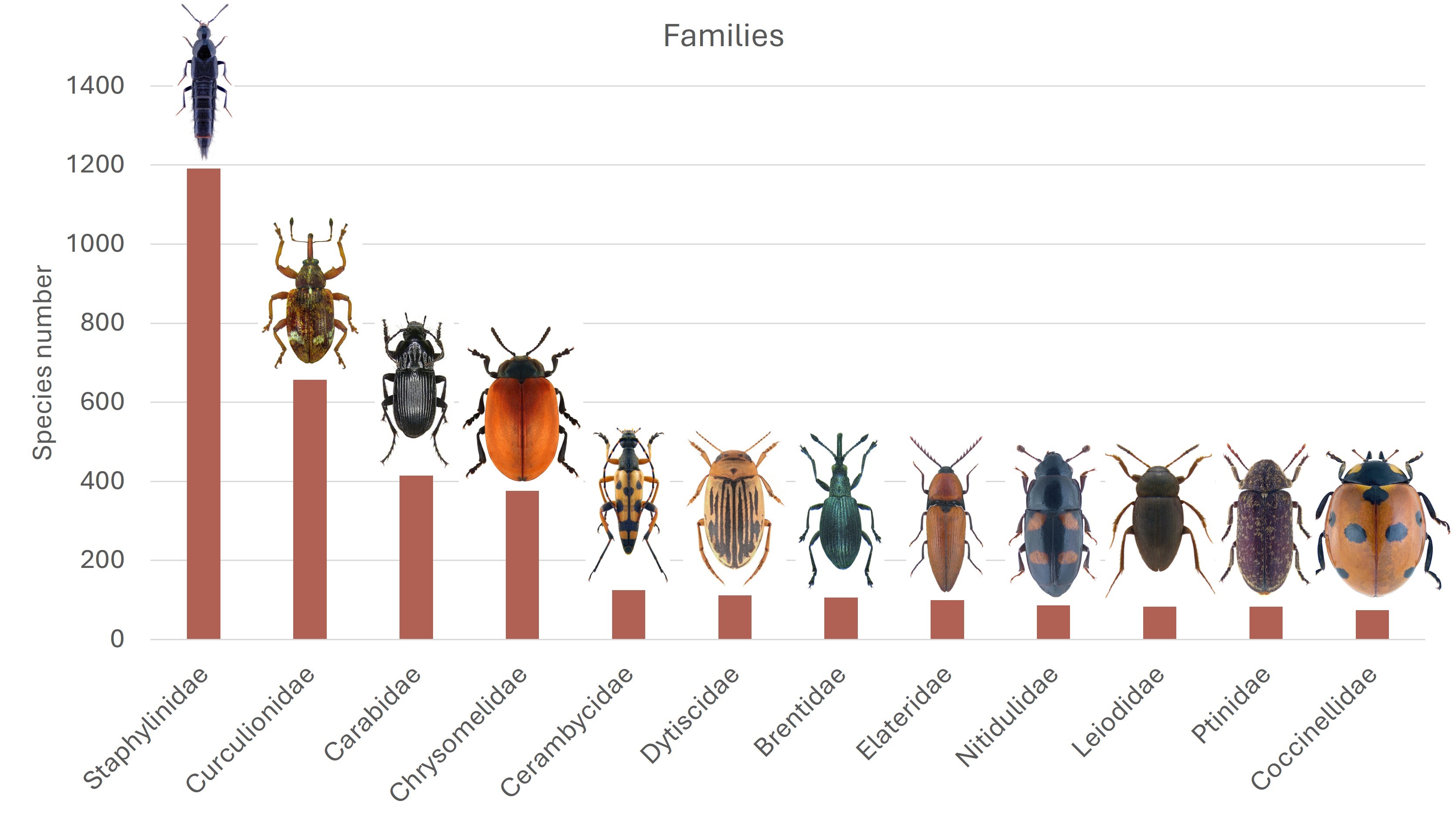 The more than four thousand species are divided among 103 families. The largest beetle families in Belgium are the rove beetles (Staphylinidae), weevils (Curculionidae), ground beetles (Carabidae), and leaf beetles (Chrysomelidae). Rove beetles (elongated and usually dark-colored) top the list with no fewer than 1,200 species.