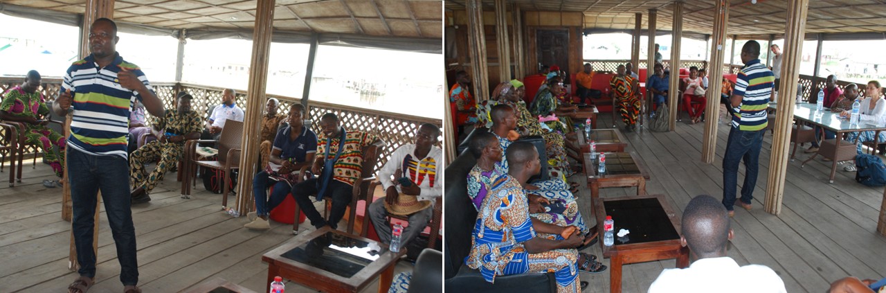 Presentation of the results to local communities during the feedback workshop held in the lakeside village of Ganvié in Benin. (© Institut de Recherches Halieutiques et Océanologiques du Bénin (IRHOB))