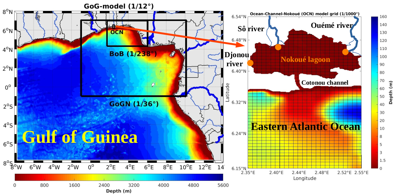 Study area in the Gulf of Guinea (southern Benin) showing the three nested domains (left) and the bathymetry of the smallest domain of the COHERENS ocean-channel-Nokoué model. The orange dots represent the locations where the rivers flow into the lagoon. (© Institute of Natural Sciences/ECOMOD-Sylvain Gozingan)
