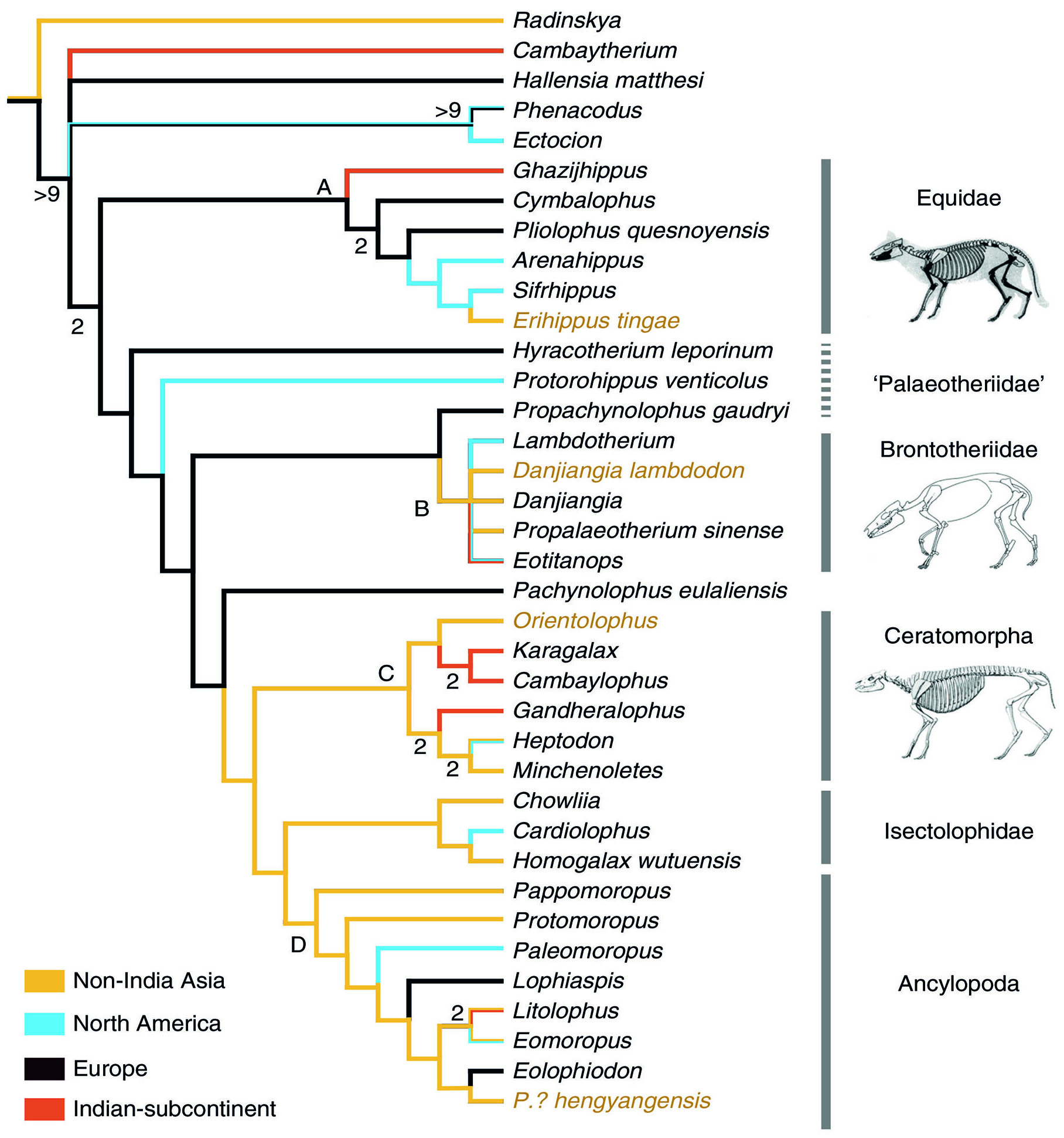 Perissodactyls are odd-toed ungulate mammals that include extant horses, tapirs, and rhinoceroses. Although most perissodactyls today are threatened with extinction, they are in fact the survivors of a much more diverse group that was very abundant during the Paleogene (66-23Ma). They also included the largest known terrestrial mammals, such as Paraceratherium. The first stages of their evolutionary history, starting at cat size, remain however poorly understood and several hypotheses have been put forward to explain their origin. Some fossil evidence links them with the Phenacodontidae, extinct primitive ungulates, suggesting a North American origin. Yet, the recent discovery of Cambaytherium in India, which shows a very close morphology to that of the first perissodactyls, makes of this mammal the best candidate for the title of sister group to the perissodactyls. However, no major synthesis with a global vision and a broad taxonomical sample, including key European fossil specimens, has yet been carried out today. This project proposes to examine the questions related to the origin of perissodactyls, from a phylogenetic and palaeogeographical point of view. It will provide a major synthesis of the fossil record and place it in an upgrade phylogenetic framework, and will also study and monitor the major evolutionary trends that are emerging within the five perissodactyl superfamilies, at the very beginning of their diversification. The methodology is based directly on the study of fossil specimens from our precious collections, including a series of exceptionally well-preserved complete skeletons of the equid Eurohippus and of the STEM-perissodactyl Hallensia from Messel (a UNESCO World Heritage site). Micro-CT scanning of these specimens as well as all RBINS type and figured specimens of early perissodactyls will allow to access hidden and therefore unknown characters, which will be described for the first time. This work will also document major evolutionary trends within the different basal superfamilies, such as those related to molarization patterns, dental homology, finger reduction which will enable us to better understand the ecology of these early perissodactyls.