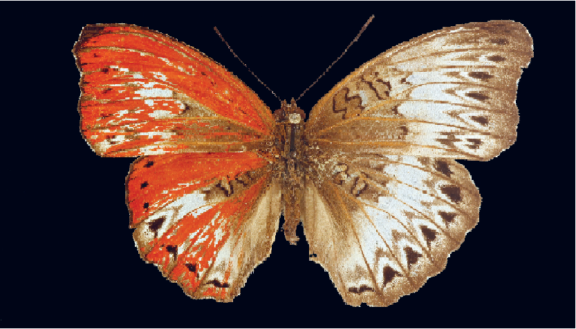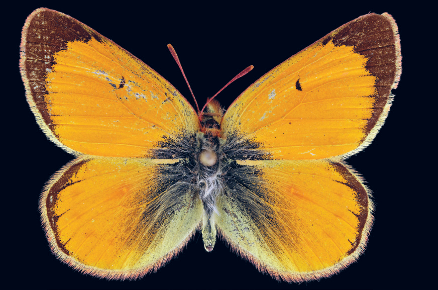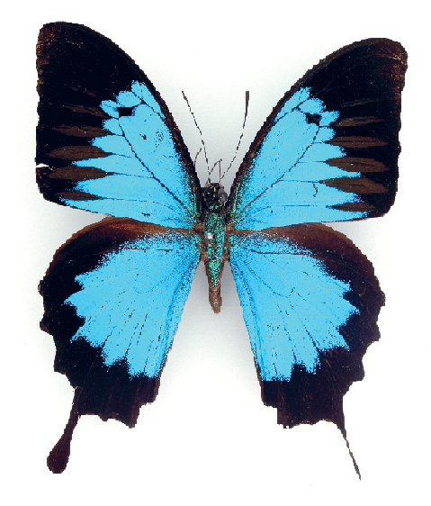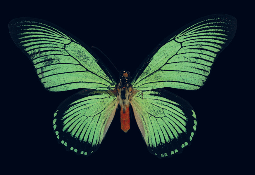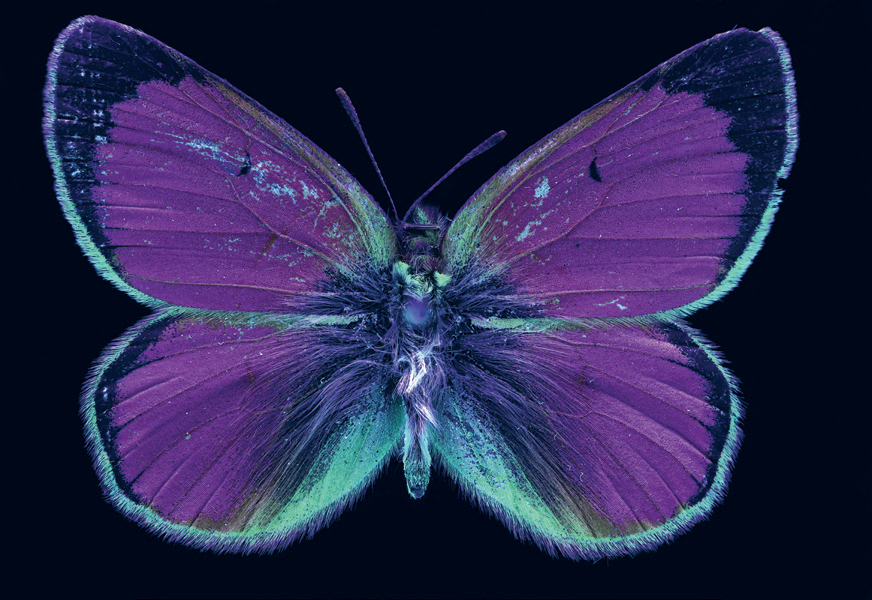 Nous, les humains, ne voyons pas tout : le spectre ultraviolet et infrarouge nous reste caché. Par exemple, les rats, les insectes et les araignées voient le spectre ultraviolet, et certains serpents voient l'infrarouge. Il est donc intéressant de rendre ces couches cachées visibles et de voir ce que ces animaux voient. De nombreux spécimens deviennent fluorescents lorsqu'ils sont exposés à la lumière UV. Cela peut indiquer des différences entre les mâles et les femelles, entre des espèces apparemment identiques, etc. Voyez comment la lumière UV rend les ailes du Colias euxanthe jaune (1) violettes, ou celles du mâle bleu de Papilio zalmoxis (2) d'un beau vert. Elle renforce également la couleur verte du phasme Neohirasea sp. (3). Les détails des ailes du criquet Dictyophorus griseus (4) deviennent plus visibles.