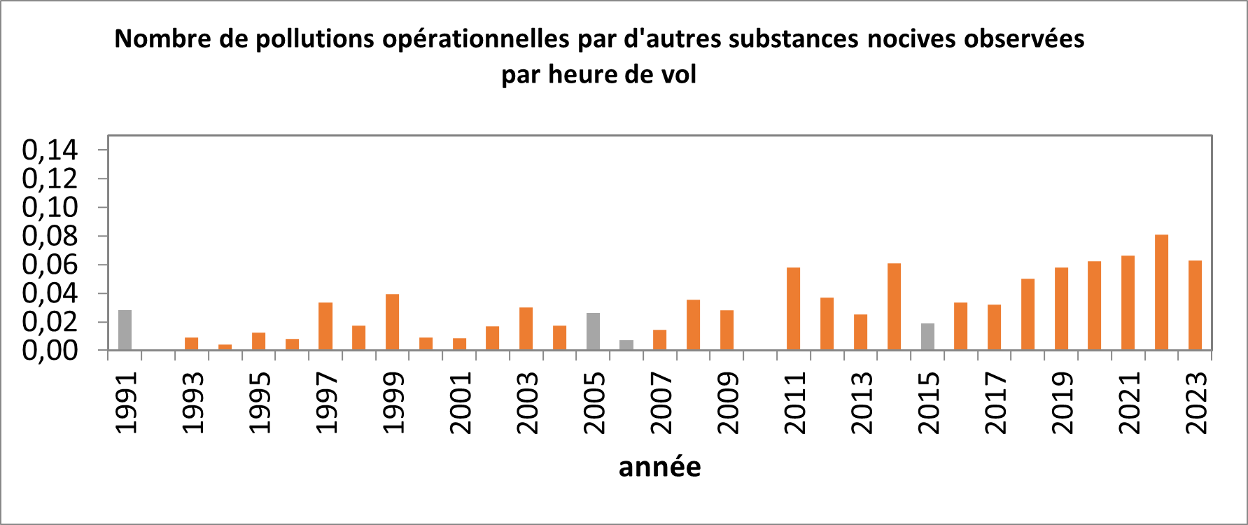 En 2023, aucune violation de l'annexe V de la convention MARPOL concernant le rejet d'ordures et de matériaux solides en vrac n'a été détectée. Cependant, 13 cas de pollution opérationnelle par des substances liquides nocives autres que les hydrocarbures (annexe II de la convention MARPOL) ont été observés, dont six ont pu être liés à un navire.
