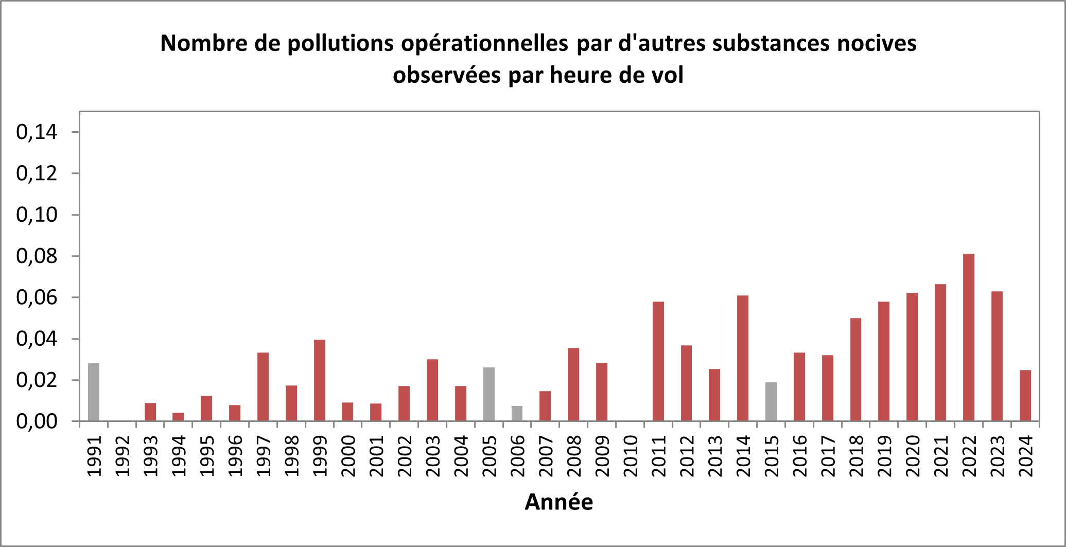 Cependant, 4 cas de pollution opérationnelle par des substances liquides nocives autres que les hydrocarbures (annexe II de la convention MARPOL) ont été observés, à chaque fois sans pollueur identifié. Il était donc impossible de déterminer la nature spécifique des liquides déversés en mer.