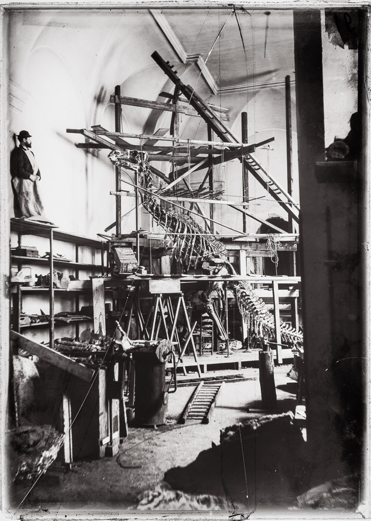 In 1883 is het eerste exemplaar in elkaar gepuzzeld. Er wordt een grote glazen kooi voor gebouwd op de binnenkoer van het Koninklijk Natuurhistorisch Museum, op het Museumplein. Zo kan het publiek deze gigant komen bewonderen. Maar de maand juli is bijzonder warm en de gelatine in de fossielen begint te smelten: er moeten drastische maatregelen worden genomen om de kooi te isoleren. Kort daarop komt er een tweede compleet skelet bij en ook een schedel en de skeletten van kleine krokodillen en schildpadden.