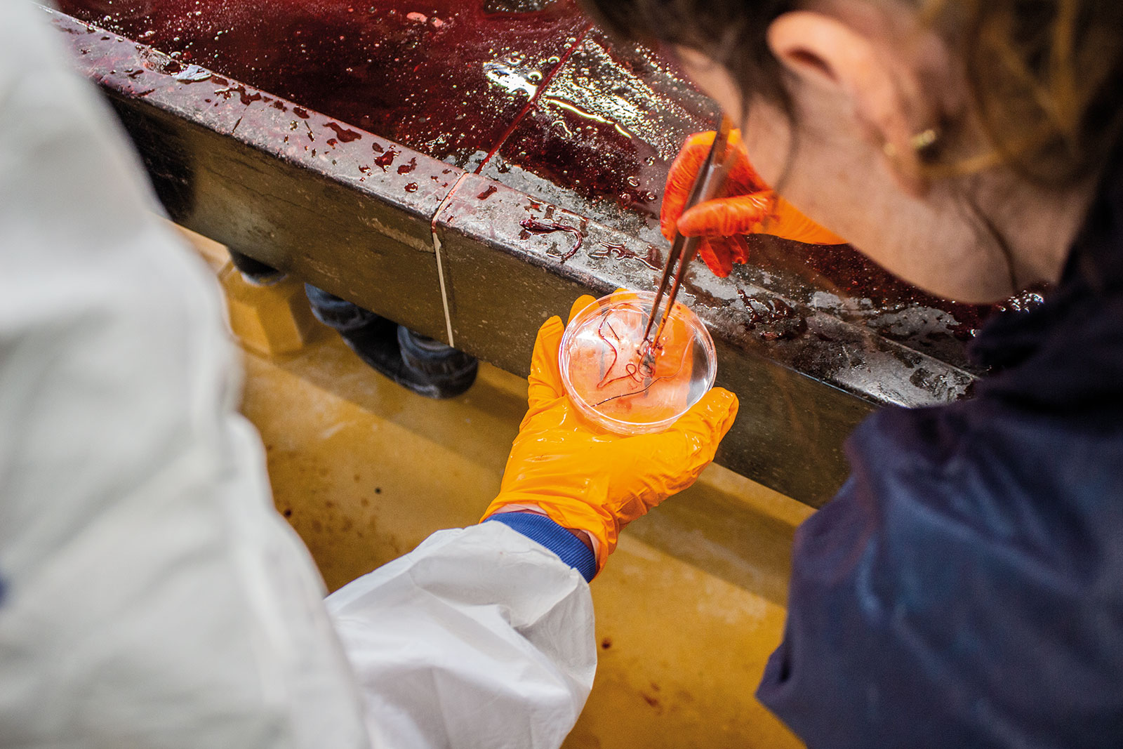 Intussen is de bruinvis bijna volledig ‘gedemonteerd’. De studenten nemen van elk orgaan nog een monster voor verder onderzoek. De weefselmonsters kunnen nu of later getest worden op de aanwezigheid van vervuilende stoffen of infecties. ‘De laatste tien jaar zien we steeds vaker bruinvissen met een virale ontsteking in de hersenen’, zegt Chiers. ‘Zo’n ontsteking kan leiden tot de dood en dus een stranding. Om de precieze rol van de betrokken virussen te bestuderen, kunnen we gearchiveerde monsters met geavanceerde moleculaire technieken onderzoeken.’