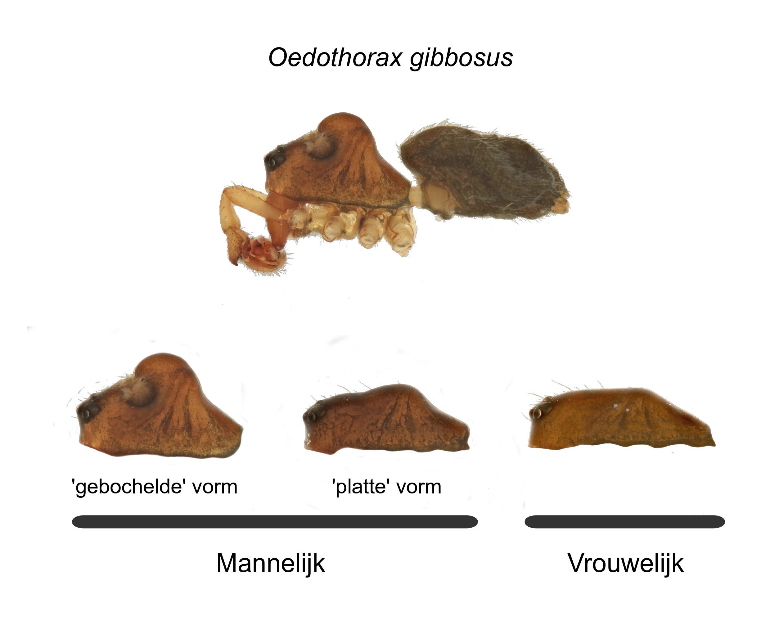 In de natuur vind je soms binnen één en dezelfde soort en binnen hetzelfde geslacht twee drastisch verschillende ‘types’. Zo heb je bij een sleutelbloemsoort exemplaren met hooggelegen helmknoppen en helmknoppen die dieper in de stengel zitten, of waterjuffers en vlinders met verschillende kleurpatronen. En ook bij de bultvelddwergspin Oedothorax gibbosus zijn er duidelijk twee types mannetjes: ‘platte’ en ‘gebochelde’. De platte mannetjes lijken meer op de vrouwtjes en zijn sneller volwassen, waardoor ze als eerste vrouwtjes kunnen bevruchten. De gebochelde exemplaren hebben een complexe kopstructuur met klieren en gevoelsharen waarmee ze bevruchte vrouwtjes alsnog kunnen verleiden om met hen te paren: het zijn ‘machomannetjes’.