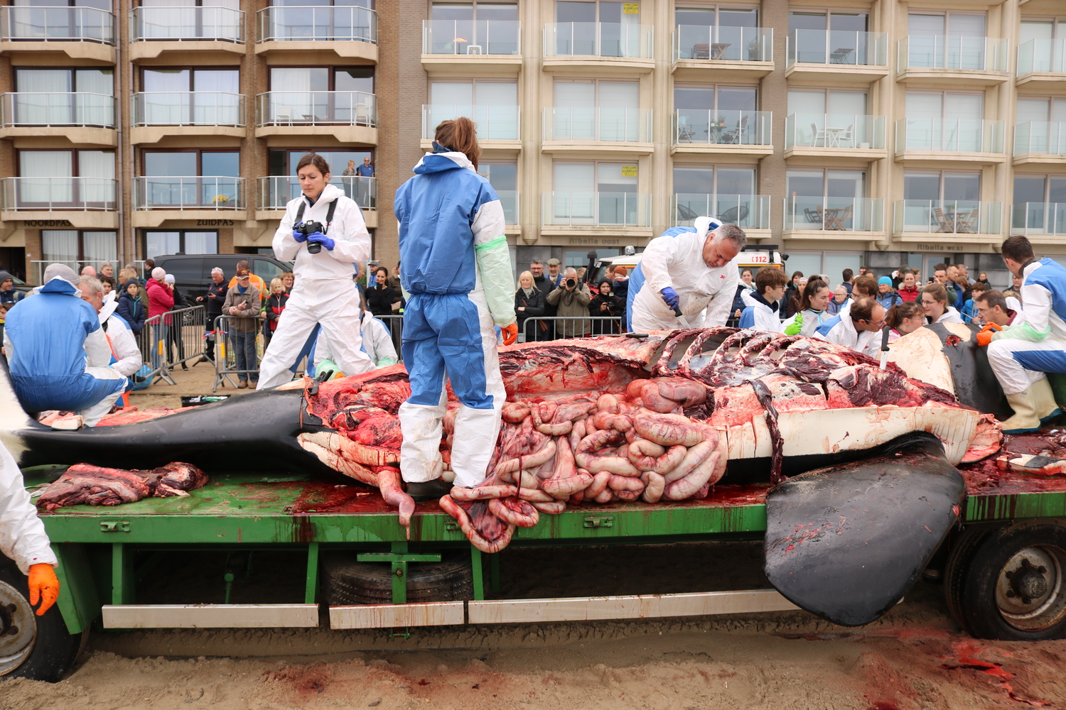 De autopsie werd op maandagochtend 30 oktober uitgevoerd door medewerkers van de faculteiten Diergeneeskunde van Universiteit Gent en Université de Liège en het Instituut voor Natuurwetenschappen. Het grote publiek kon het gebeuren, dat een drietal uren in beslag nam, vanop een afstand volgen. Alle lichaamsdelen en organen werden uitwendig en inwendig geïnspecteerd, en er werden diverse weefselstalen verzameld voor verdere microbiologische (ziektekiemen) en ecotoxicologische (o.a. chemische vervuiling) studies.