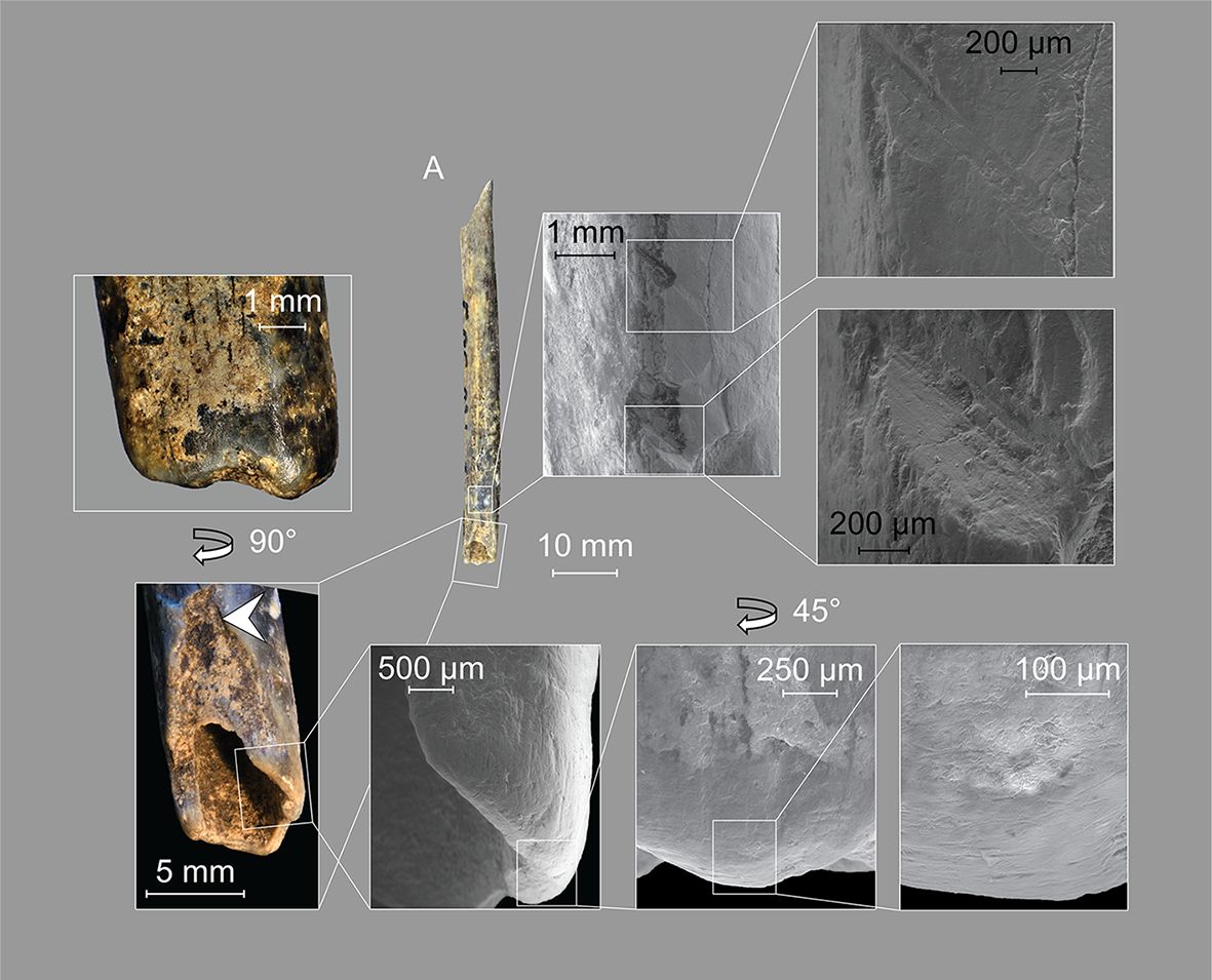 Veel van de botten waren door vlees- of aaseters in de grot gebracht. Maar op zeven (mogelijk acht) van de exemplaren waren snijsporen door neanderthalers te zien. En bij één ging het verder dan het vlees wegsnijden. Het spaakbeentje van een auerhoen vertoont twee diepe insnijdingen, wat op botbewerking wijst, en een gepolijst uiteinde. Onderzoek door TraceoLab heeft aangetoond dat dit object is gebruikt en dat de polijsting waarschijnlijk het resultaat is van wrijving met zacht organisch materiaal. Het zeldzame gebruiksvoorwerp uit de Scladina-grot dateert van zo’n 130.000 jaar geleden, tijdens de voorlaatste ijstijd (het saaliaan), toen de Scandinavische ijskap tot in het midden van Nederland reikte.