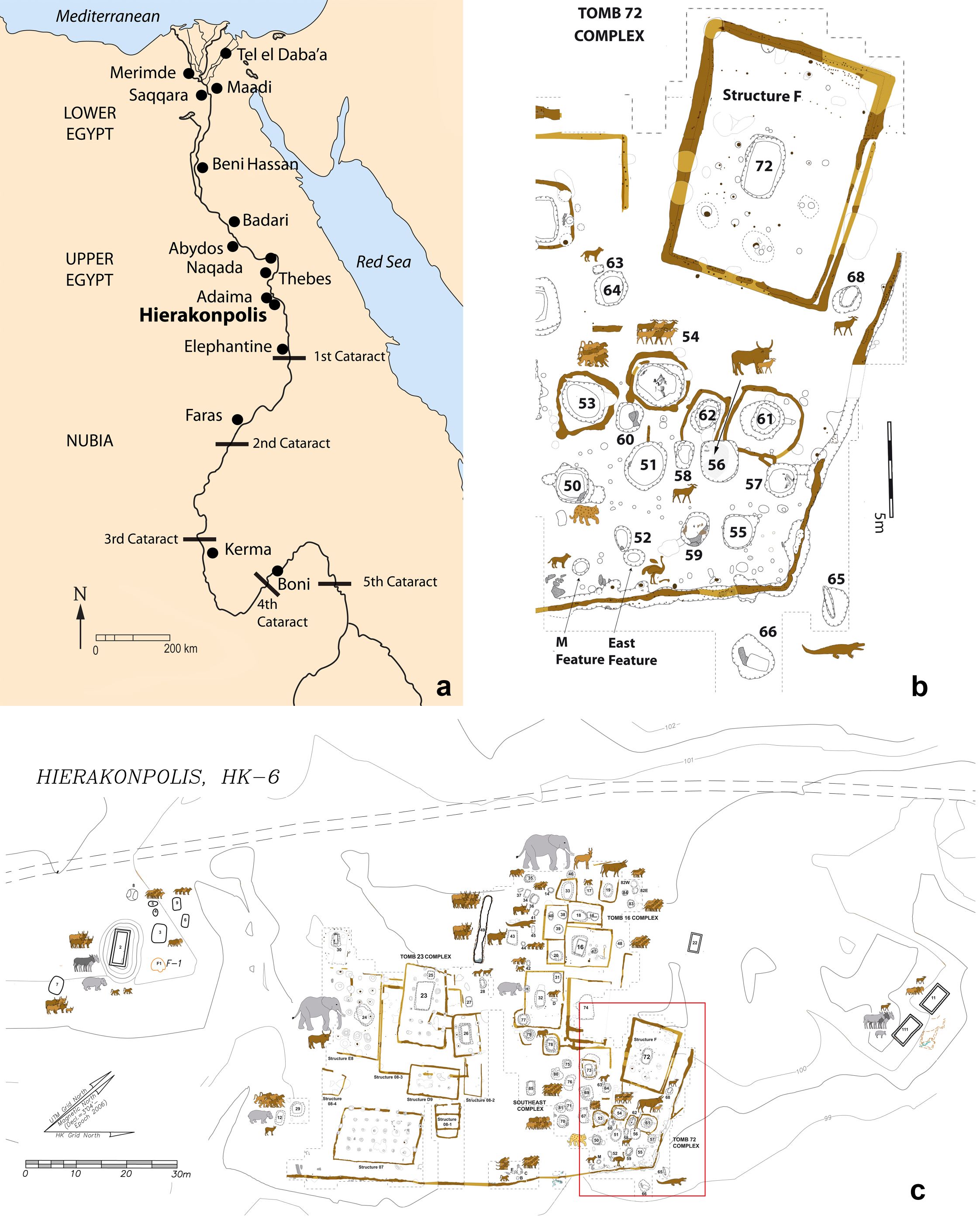 Op de elitebegraafplaats werden behalve notabelen maar liefst 180 dieren begraven. Een vijfde ervan zijn wilde dieren, zoals lokale nijlpaarden en krokodillen, maar ook bavianen en olifanten die uit het zuiden waren ingevoerd. Archeologen groeven er ook veel katten, honden en vee op. Hierakonpolis is door zijn hoeveelheid en variëteit aan dieren uniek, en is meteen ook de oudste dierentuin.